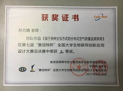 大赛是面向全国高等院校、职业院校在读学生的一项团体性创意实践活动,涉及电子、信息、通信、计算机、控制、传感等多门学科及领域,以“开放、创新、公平、公正”为组织原则。由我实验室孙力娟老师指导的“基于多种交互方式的分布式空气质量监测系统”(完成人:张胜东、魏广涛、杜宁、周辉、王池)获得本次大赛三等奖。