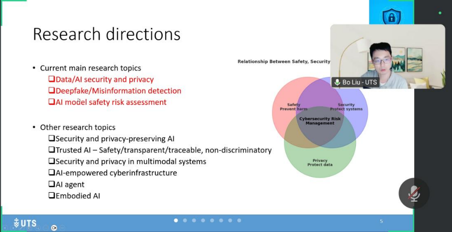 2026年1月23日上午,悉尼科技大学计算机科学学院副教授,澳大利亚人工智能研究所人工智能安全与隐私研究实验室的核心成员兼主任刘勃教授,应南京邮电大学计算机学院、软件学院、网络空间安全学院邀请,通过线上方式作了题为《从数据安全与隐私到人工智能安全与隐私》的专题学术报告。本次报告由南京邮电大学黄海平教授主持,物联网智能感知与计算重点实验室的广大师生踊跃参与。